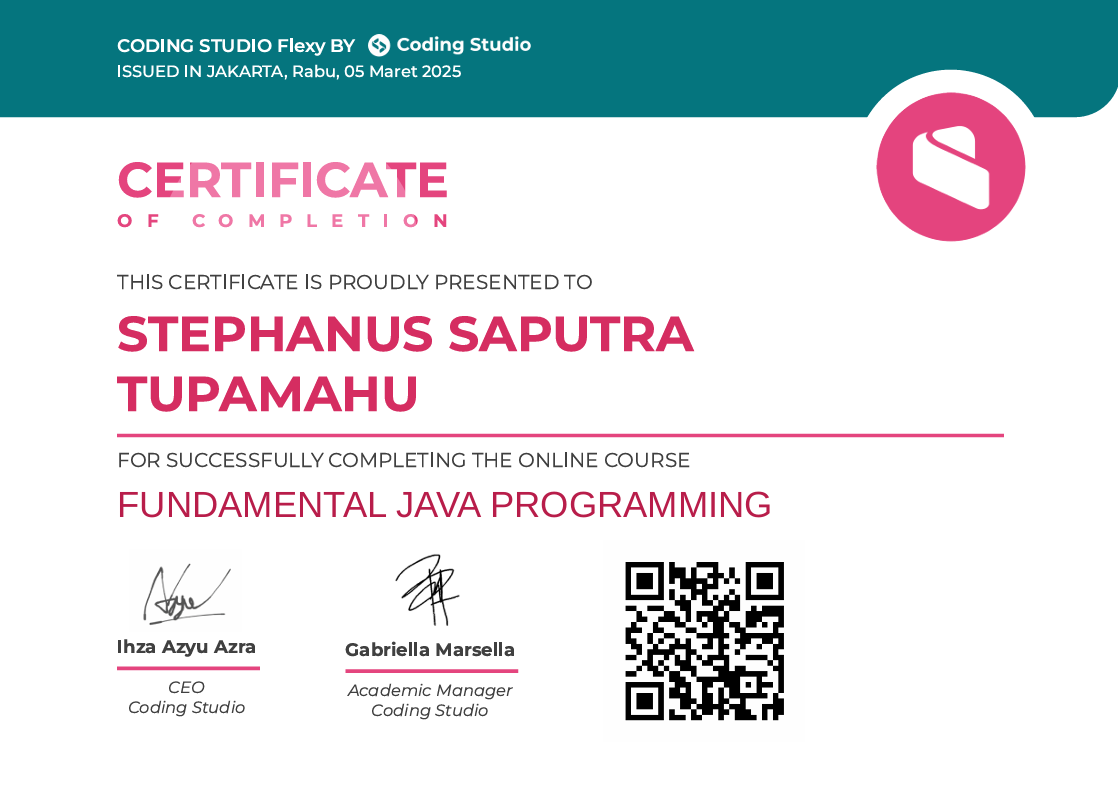 Successfully complete the Fundamental Java Programming course, covering core Java concepts such as OOP, data types, control structures, and basic algorithm implementations.