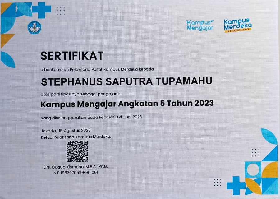 Certificate of participation as a teaching volunteer in the Kampus Mengajar Batch 5 Program (February – June 2023), organized by Kampus Merdeka, Ministry of Education, Culture, Research, and Technology of the Republic of Indonesia. Signed by Drs. Gugup Kismono, M.B.A., Ph.D., Head of the Kampus Merdeka Implementation Unit.