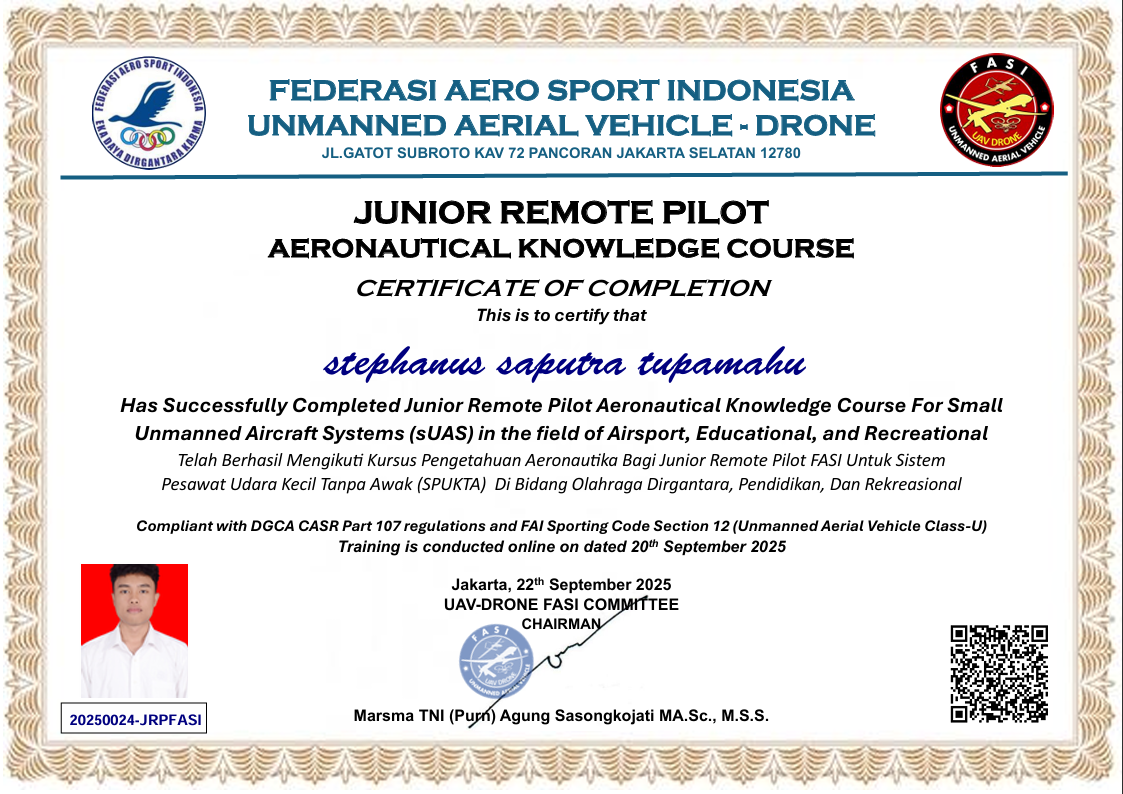 Has Successfully Completed Junior Remote Pilot Aeronautical Knowledge Course For Small Unmanned Aircraft Systems (sUAS) in the field of Airsport, Educational, and Recreational