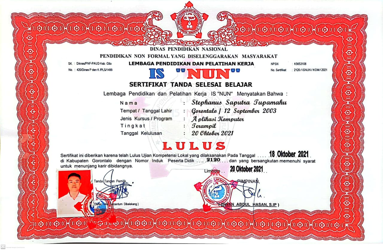 Computer Completion Certificate from the IS NUN Vocational Education and Training Institute. I learned basic computer skills, including mastery of Microsoft Office (Word, Excel, PowerPoint) to support my work productivity.